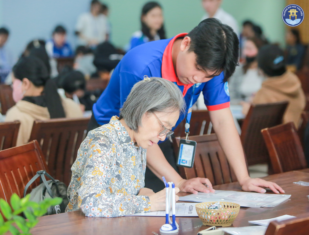 반히엔대학교 입학일의 활기찬 분위기 속에서, 수백 명의 젊은 신입생들 사이로 은빛 머리와 온화한 미소, 그리고 신념으로 빛나는 눈빛을 지닌 한 여성이 많은 이들의 시선을 사로잡았습니다. 그 주인공은 응우옌 티 뚜 호앙(Nguyễn Thị Tú Hoàng) 씨로, 62세의 중국어학과(번역·통역 전공) 신입생입니다.